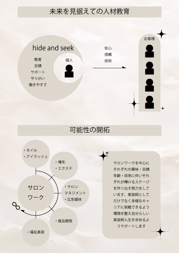 hide and seekでは、美容師としてカット・カラーなどのサロンワークを行いながら、ネイリスト・アイリスト・増毛師・エンディングカット・福祉美容師‥など、自分の興味のあることに挑戦して頂くことも可能です。新たな可能性を広げていきましょう。