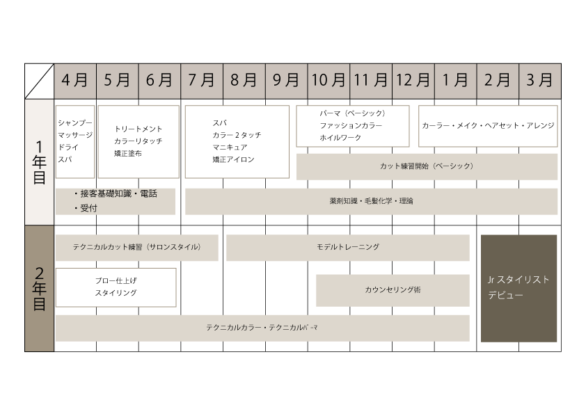 hide and seekでは独自のカリキュラムに沿って、入社1年目からカットの練習が始まります。アシスタント時は営業時間を利用して、マンツーマンで技術指導を行います。その為、最短1年半でJrスタイリストデビューできます。又、カリキュラム終了技術ごとに主担当で入客することが可能です。例えば、カラー技術ができるようになれば、カラーのみのお客様の主担当で入客可能です。